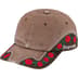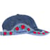 All cotton denim 6-Panel hat with self strap closure. Embroidered cotton chino twill panels on crown and visor. Embroidered logos on sides.