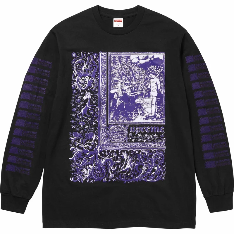 All cotton classic Supreme long-sleeve t-shirt with printed graphic on front. Printed logos on sleeves and back. Original artwork by Miho Kuroyanagi.
