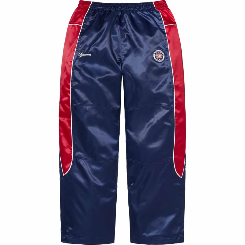 Satin with mesh and taffeta lining. Welt hand pockets and single hidden back zip pocket. Bottom gussets with zip closure and elastic waistband with interior drawcord. Embroidered logos at thigh and back leg. Embroidered patch on thigh.