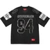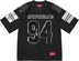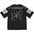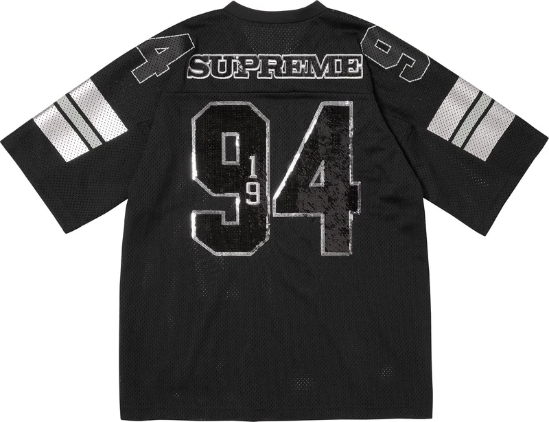 Poly eyelet mesh with sequin appliqué at front and back. Printed graphic on sleeves and athletic label at lower front.
