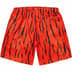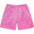 Poly eyelet mesh with baggy fit. On seam hand pockets and single back zip pocket. Elastic waistband with interior drawcord. Embroidered logo patch at thigh.