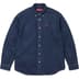 All cotton denim with button down collar and embroidered logo patch on chest.