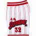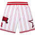 Poly eyelet mesh with mesh lining. On seam hand pockets and single back zip pocket. Knit rib waistband with interior drawcord. Tackle twill logo appliqué and printed graphic at sides.