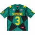 Poly dazzle jersey with tackle twill appliqué at front, shoulders and back. Embroidered patches on chest and athletic label at lower front.