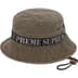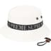 All cotton boonie with cord closure and leather cord stopper. Jacquard logo webbing at crown.