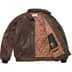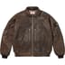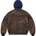 Cowhide leather with quilted cupro lining. Welt hand pockets at lower front with zip chest pockets and interior chest pocket. Removable nylon hood with interior elastic shockcord and removable archival Stone Island® goggles. Elasticized leather hem and knit rib cuffs. Embroidered logos at hand pocket and back. Removable Stone Island® badge at sleeve. includes logo dust bag. Made exclusively for Supreme.