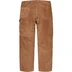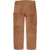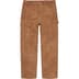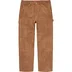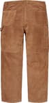 Suede with taffeta lining. Utility style with zip fly, double knee, single coin pocket, utility pockets and hammer loop at left leg.