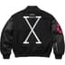 Wool blend with cowhide leather sleeves, fill and quilted satin lining. Snap front closure with double welt leather hand pockets at lower front and interior chest pocket. Knit rib collar, cuffs and hem. Felt and chenille appliqué at chest and sleeve. Embroidered logo on chest and embroidered graphic on sleeve and back.