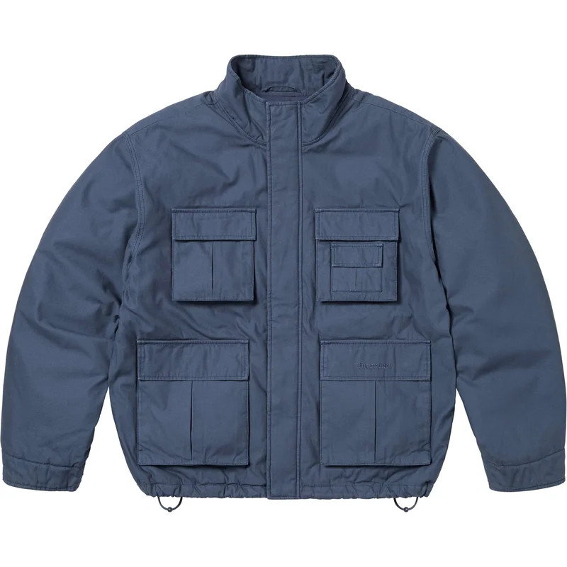 All cotton with fill, quilted cotton lining and taffeta sleeve lining. Full zip closure with hidden snap placket. Button flap cargo pockets at lower front with dual top and side entry. Button flap cargo pockets at chest and interior chest pocket. Interior elastic shockcord at hem and velcro tab adjusters at cuffs. Embroidered logo on pocket flap and printed graphic on back sleeve. Jacquard woven patch at back. Made by Alpha Industries® exclusively for Supreme.