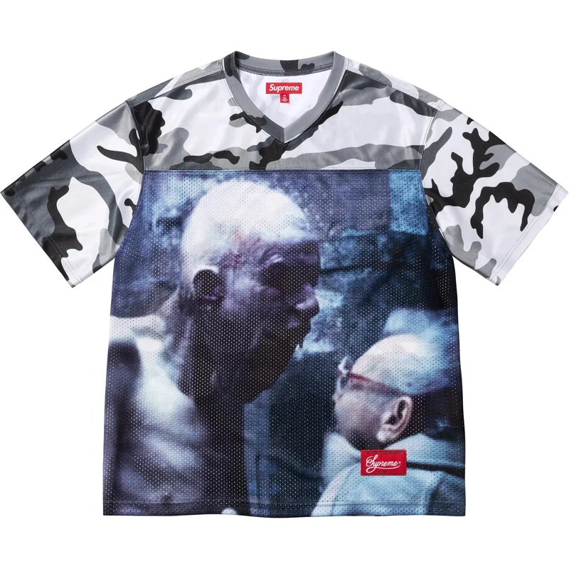 Poly eyelet mesh and dazzle jersey with printed graphic on front and back. Athletic label at lower front.