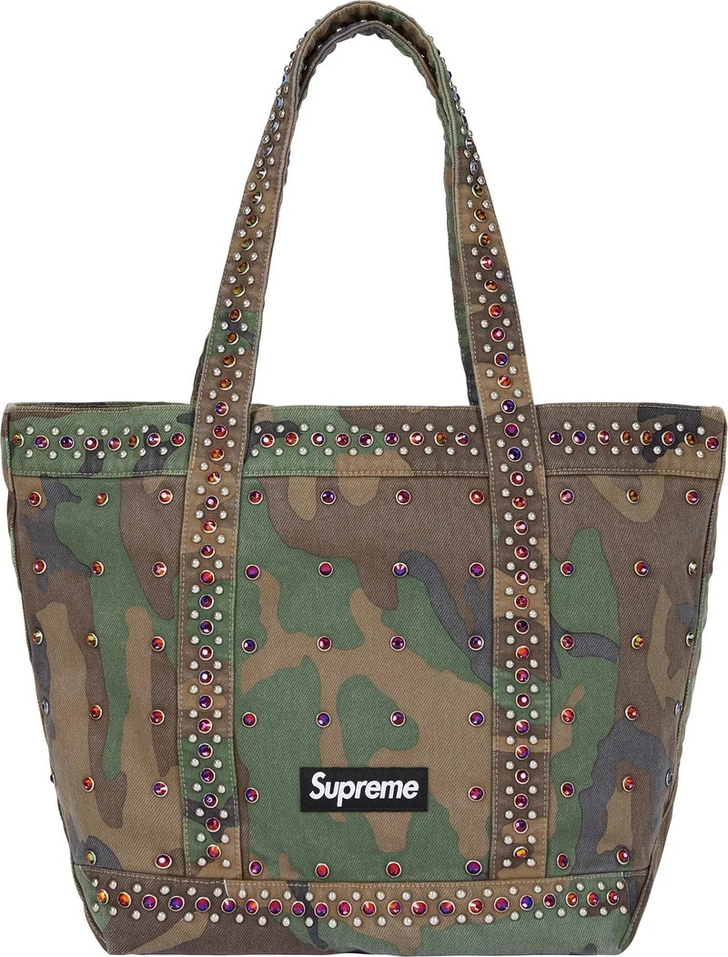 All cotton 13 oz. denim with rhinestones, metal studs and cotton lining. Pouch pocket at back. Woven logo label at front and rhinestone studded metal plate at back. 22L.