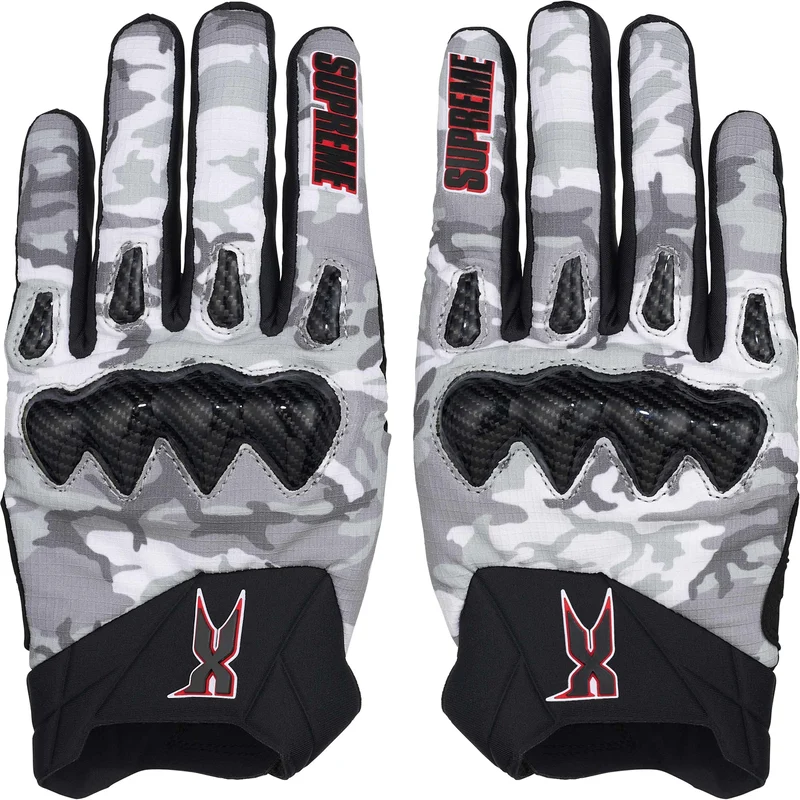 Fox Racing® Ripstop Bomber Gloves with custom graphic application. Stretch nylon construction with molded plastic knuckle and finger coverage. Compression molded neoprene cuff with hook and loop closure. Padded double-layer palm with touchscreen compatibility. TPU logos at top. Made exclusively for Supreme.