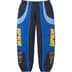 Brushed-back fleece with on seam hand pockets and single back zip pocket. Elastic cuffs and waistband with interior drawcord. Embroidered twill logo appliqué at sides and embroidered graphics at lower legs.