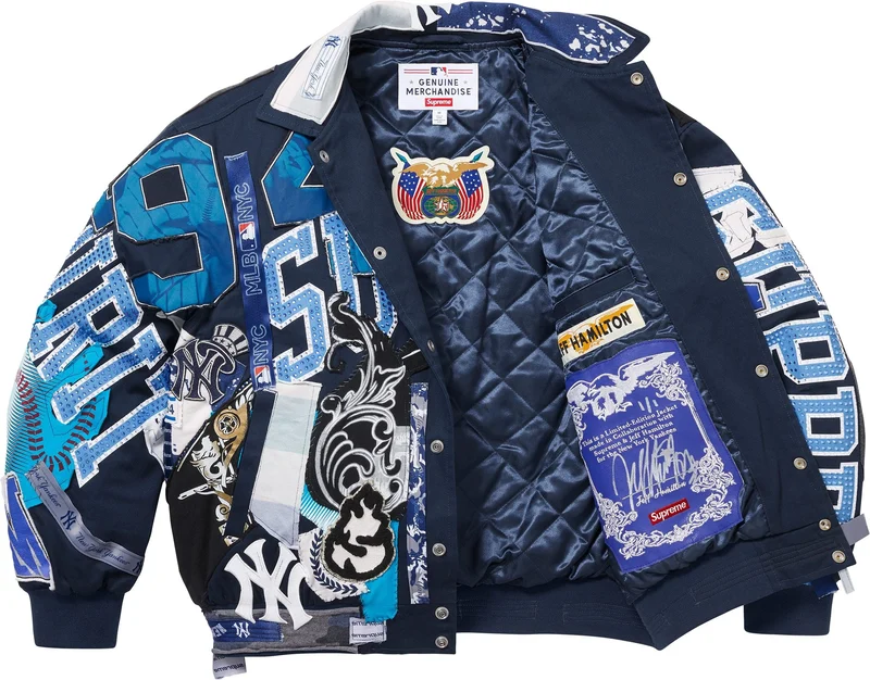 Brushed cotton twill with fill and quilted satin lining. Snap front closure with welt hand pockets at lower front and interior chest pocket. Knit rib cuffs and hem. Chenille, printed jersey and embroidered patches throughout with rhinestone and metal studs. Jacquard graphic woven taping throughout. Signed leather patch at interior pocket. Limited edition official Yankees™ merchandise made in the USA exclusively for Supreme.