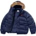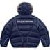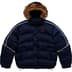 Water resistant poly with filled quilted baffles and taffeta lining. Full zip closure with snap placket. Double welt zip hand pockets at lower front and interior zip pocket. Removable hood with faux fur trim. Interior elastic shockcord at waist and velcro tab closure at elastic cuffs. Embroidered logos on chest, back and back hem. Reflective piping throughout. Made exclusively for Supreme.