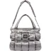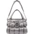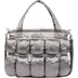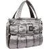Poly with nylon lining and individual filled patch pockets throughout. Main compartment with snap closure, interior pouch and zip pockets. Additional zip pocket at front and snap pouch pocket at back. Removable shoulder strap. Woven logo label at front. 11L.