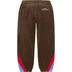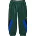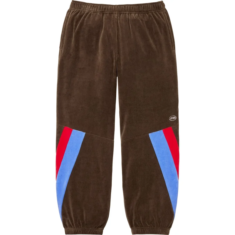 Cotton blend velour with on seam zip hand pockets and single back zip pocket. Elastic cuffs and waistband with interior drawcord. Embroidered logos at lower leg and back pocket.