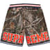 Poly mesh with mesh lining. On seam hand pockets and single back zip pocket. Stripe rib waistband with interior drawcord. Tackle twill appliqué at front and back thighs. Embroidered graphic at waist and back pocket. Made exclusively for Supreme.