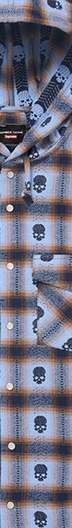 All cotton flannel with woven pattern. Snap front closure with snap flap patch pocket at chest.