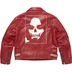 Custom fit Schott® Perfecto leather jacket with full satin lining. Full zip closure with zip hand pockets and zip chest pocket. Snap flap pocket at lower front and interior chest pocket. Studded belted front and zip openings at cuffs. Debossed logos on pocket flap and printed graphic on back. Enamel logo pin included. Made in the USA exclusively for Supreme.