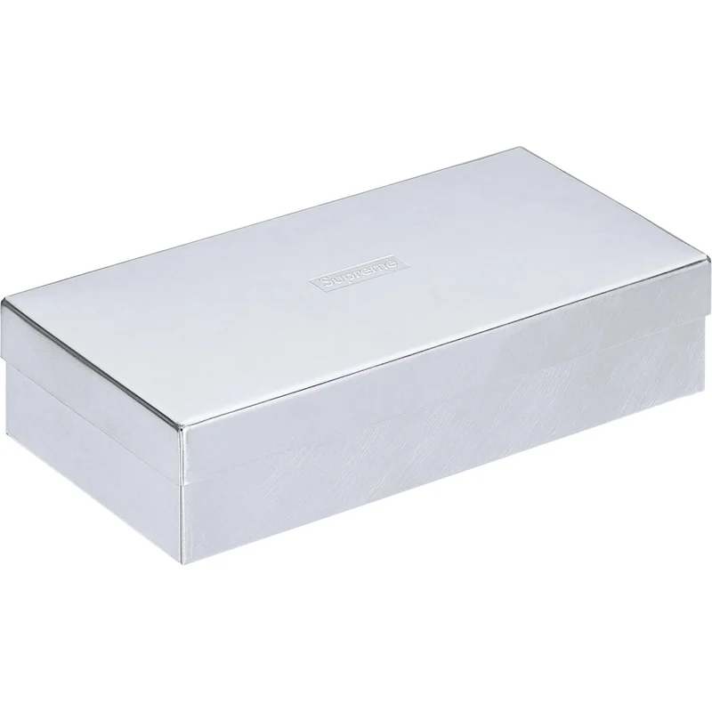 Handmade tinplate box with debossed logo. 3.9” x 7.9” x 1.9”. Handmade in Japan exclusively for Supreme.