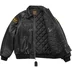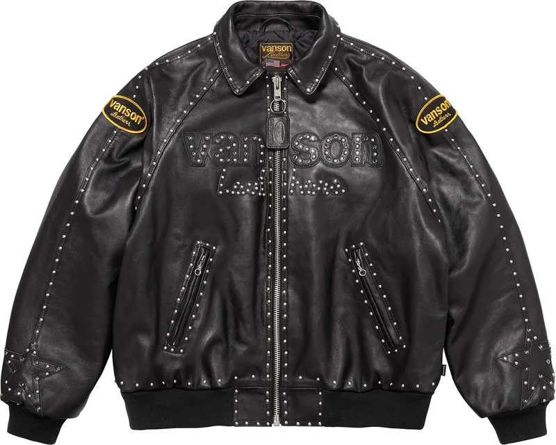 Cowhide leather with rhinestones and metal studs throughout, fill and quilted nylon lining. Full zip closure with double welt zip hand pockets at lower front and interior chest pockets. Knit rib cuffs and hem. Studded leather logo appliqué at front, sleeves and back. Embroidered logo patches on sleeves. Rhinestone studded metal logo plate at back neck. Made in the USA exclusively for Supreme.