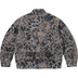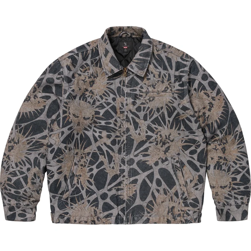 All cotton 14 oz. denim with printed graphic, fill and quilted taffeta lining. Full zip closure with welt hand pockets at lower front and welt chest pocket. Interior patch pocket. Button tab adjusters at cuffs and back hem. Printed logos on back hem. Original artwork by Joe Chatt.