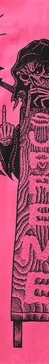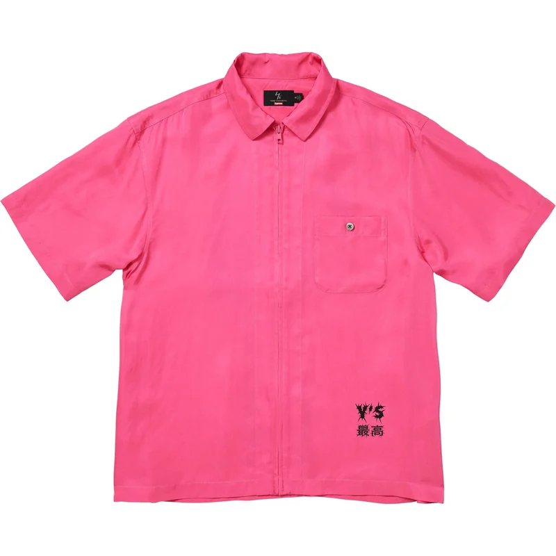 Silk blend twill with full zip closure. Single chest pocket with button closure. Printed logo at lower front and printed graphic at back. Original artwork by Joe Chatt.