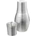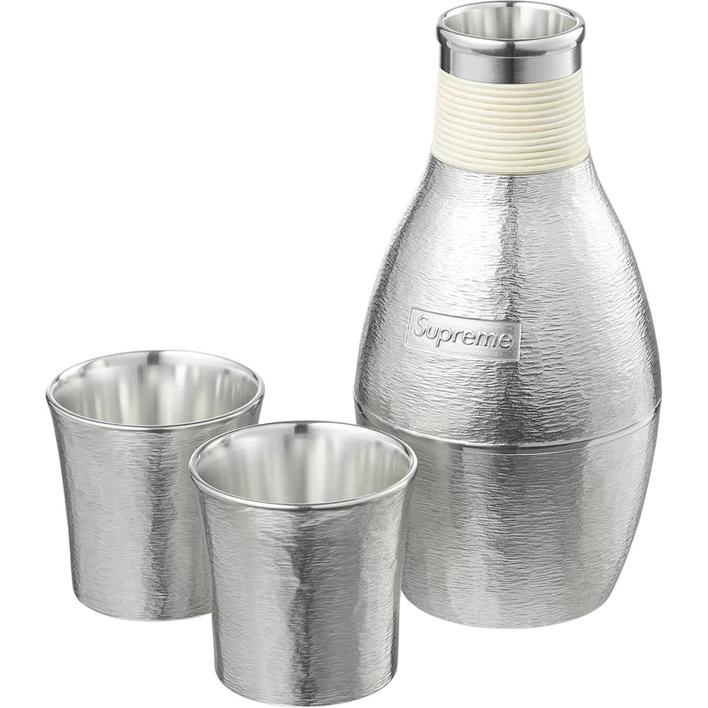 Tin sake bottle with debossed logo. Includes two cups. Bottle: 4.72" x 1.22". Cups: 1.77" x 1.77". Made in Japan.