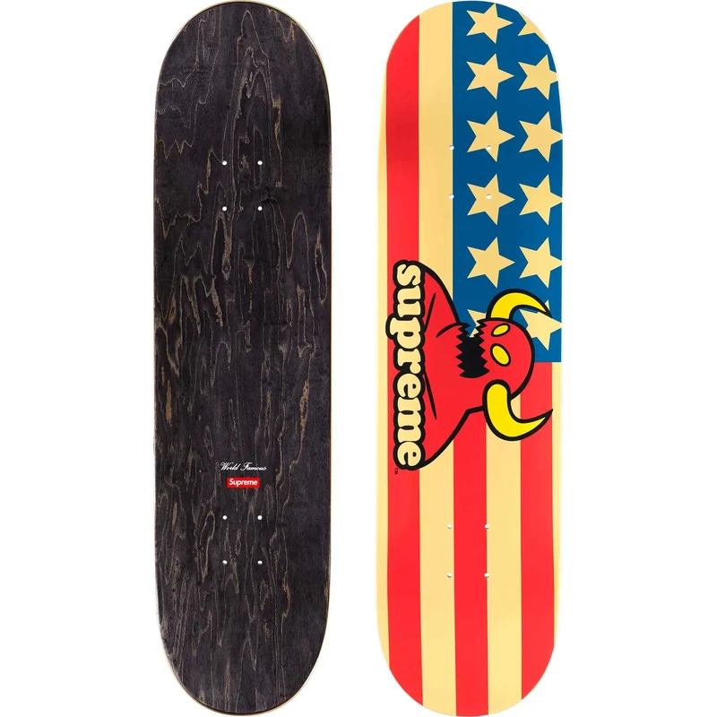 Supreme skate deck with natural veneer and black top ply. Printed graphic on bottom with printed World Famous and box logo on top.