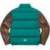 Water resistant nylon with down filled quilted baffles and studded cowhide leather sleeves. Full zip closure with welt zip hand pockets at lower front. Zip pocket at sleeve and interior snap pocket. Interior elastic shockcord at hem. Removable velcro patch on chest, printed graphic on sleeve and printed logo at back hem.