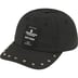 All cotton 6-Panel hat with self strap closure. Metal studs on visor and printed patches on front.