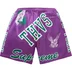 Poly eyelet mesh with printed graphic and mesh lining. On seam hand pockets and single back zip pocket. Elastic waistband with interior drawcord.