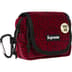 Nylon with velvet flocking and cotton ripstop lining. Main compartment with velcro top flap closure and interior organizer pocket. Additional front zip pocket. Utility bands at back and carabiner attachment. Woven logo label on front with pinback button included. 3.5" x 5.1" x 2".