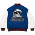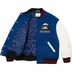 Wool blend with cowhide leather sleeves, fill and quilted satin lining. Snap front closure with double welt leather hand pockets at lower front and interior chest pocket. Knit rib collar, cuffs and hem. Felt and chenille appliqué at chest and back. Embroidered graphic at cuff.