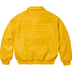 Woven lambskin leather with fill and satin lining. Full zip closure with welt hand pockets at lower front and interior chest pocket. Elasticized leather cuffs and hem. Leather logo appliqué at back.