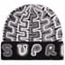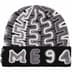 Handmade wool cuffed beanie with hand-knit yarn logo appliqué at cuff.
